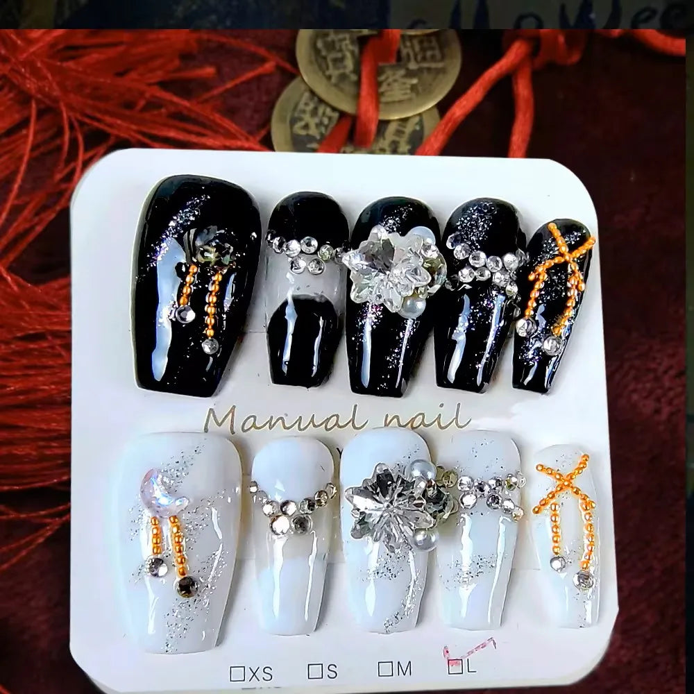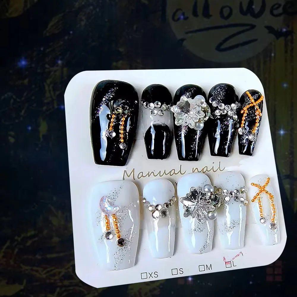 10pcs High Quality Handmade Press on Nails Medium Ladder Black White Thick Acrylic Nail Manicure Art Accessories For Kids Girl