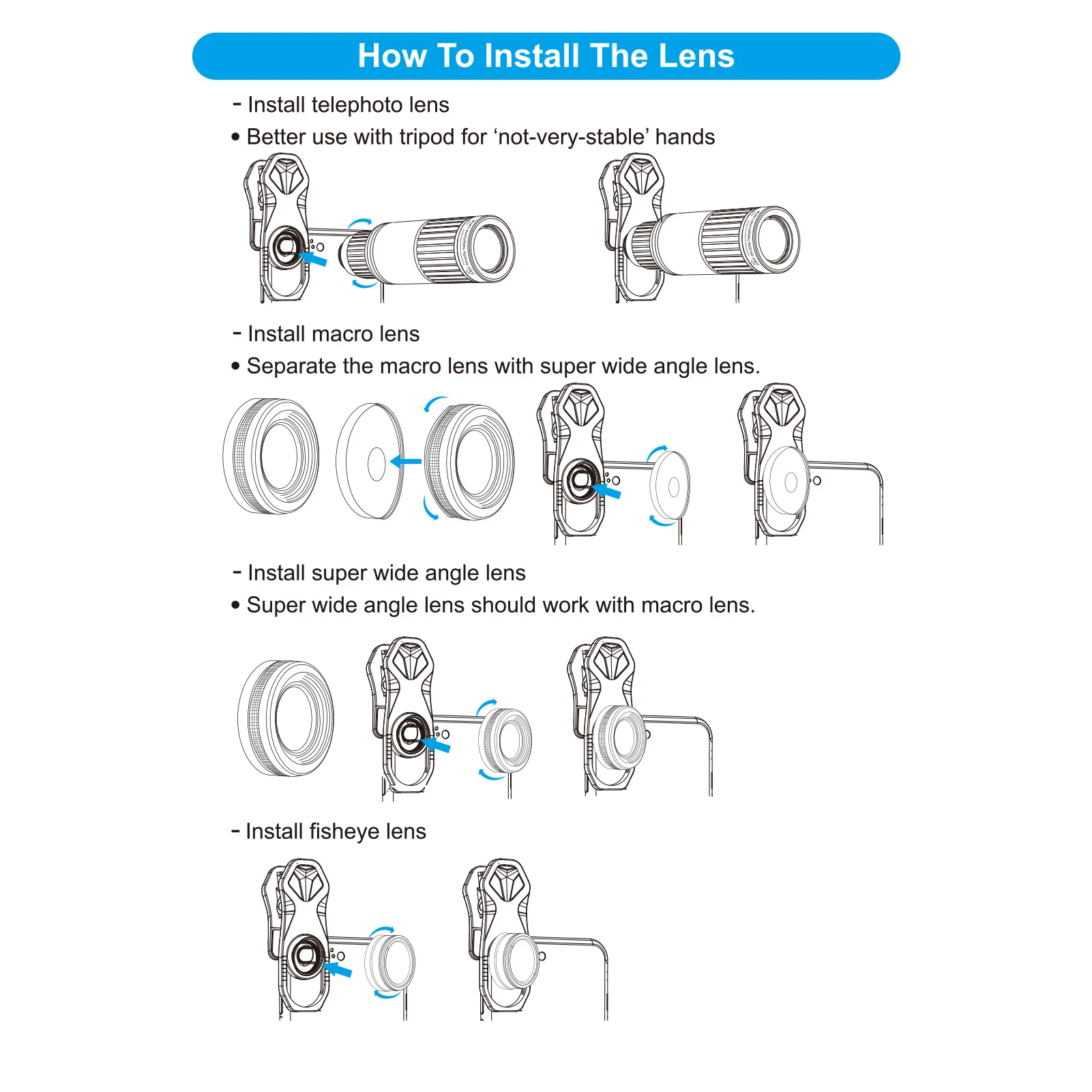 - Universal clips = fits most phones (best on your main camera)