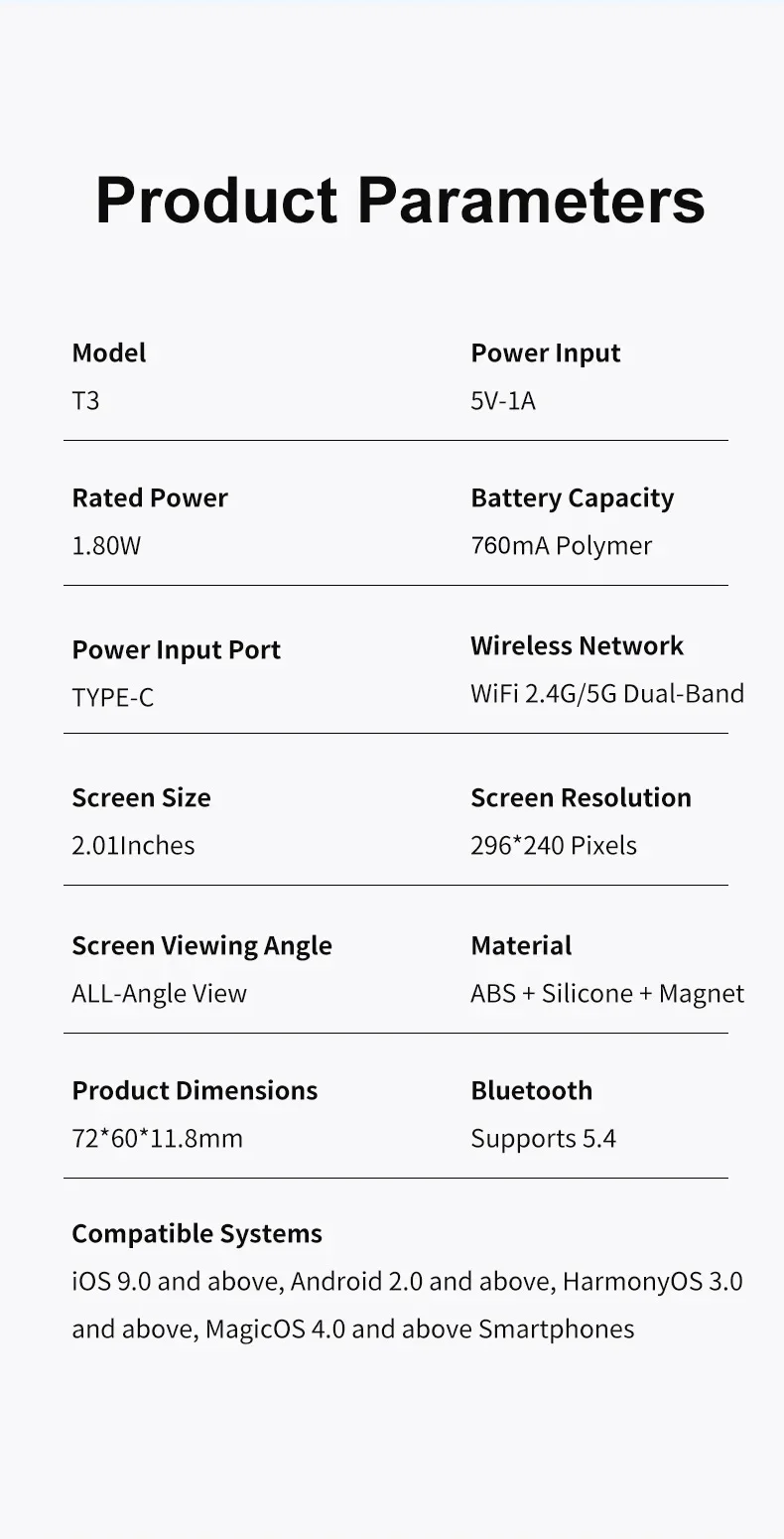 Compatible with Mobile phones with I0S system 9.0 or above, Android 2.0 or above, HarmonyOS system 3.0 or above, MagicOS system 4.0 or above, etc
