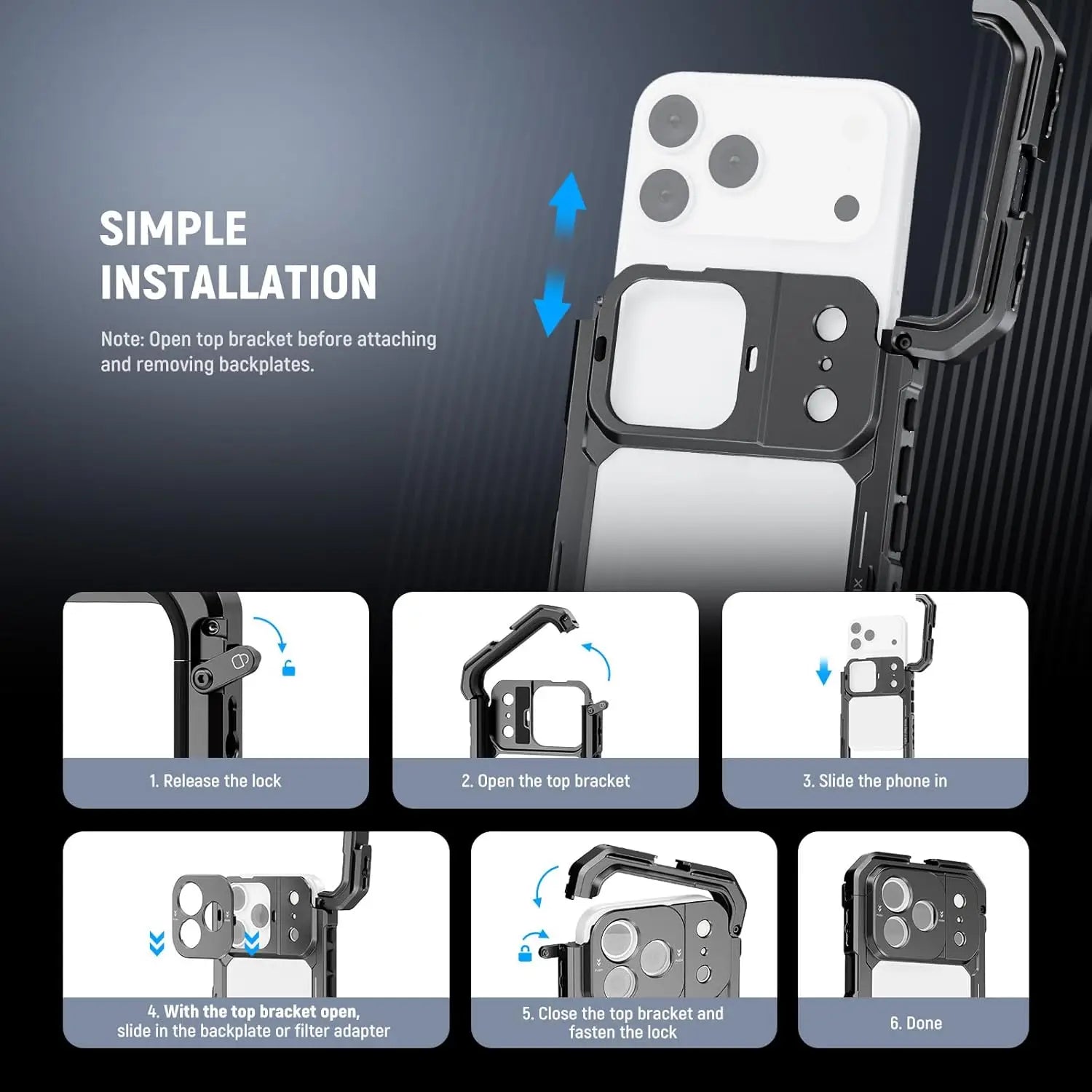 【Compatible with iPhone 17 Pro Max】 Tough aluminum alloy frame and shockproof linings shield your cell phone during daily use. 3 interchangeable backplates connect filters and lenses for creative shots. Note: Open top bracket before mounting backplates, then close to secure